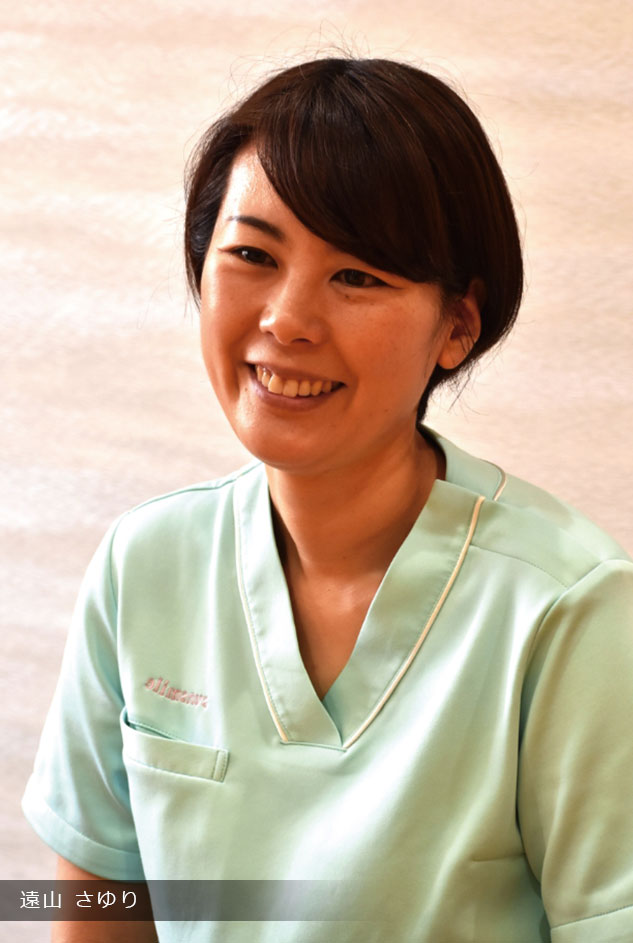看護師として病院に勤めていましたが、「ひとり一人に寄り添って生活のお手伝いがしたい」と考え、サンスマイルに入社をしました。入居者さんとのコミュニケーションを1番に考え、とにかく明るく声をかけるようにしています。